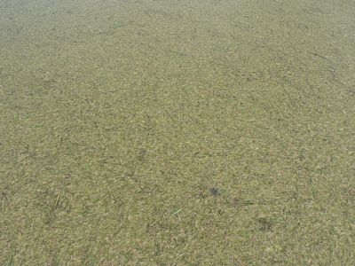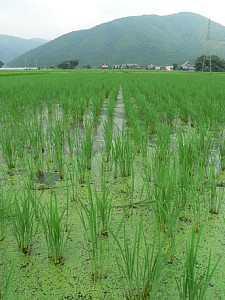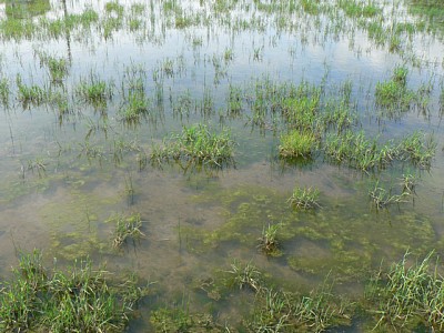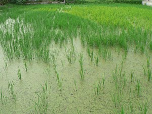 こちらの田んぼは、浮き草ではなく、アミミドロやアオミドロの藻類が