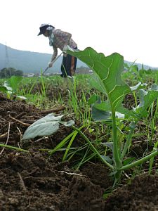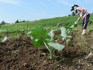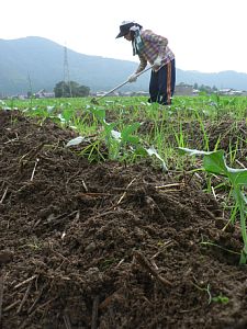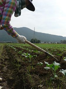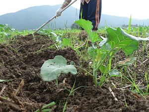 鍬で土をほぐすことで、ブロッコリーの根が活性化され、