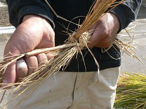 わらの紐を使って、稲の束を作ってます。