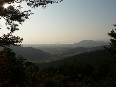 頂上間近のビューポイントから眼下に望む、びわ湖と竹生島