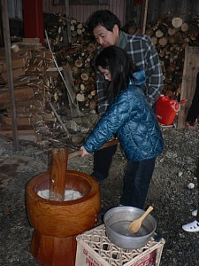 父に指導を受け、いざ、もちつきスタート!!