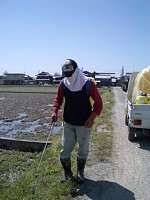 極力、除草剤は使用したくないのですが、面積が約23haという実情では、田植え準備に忙しいこの時期、全ての圃場を草刈除草では追いつきません。